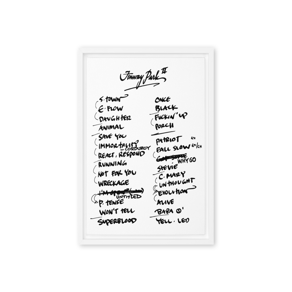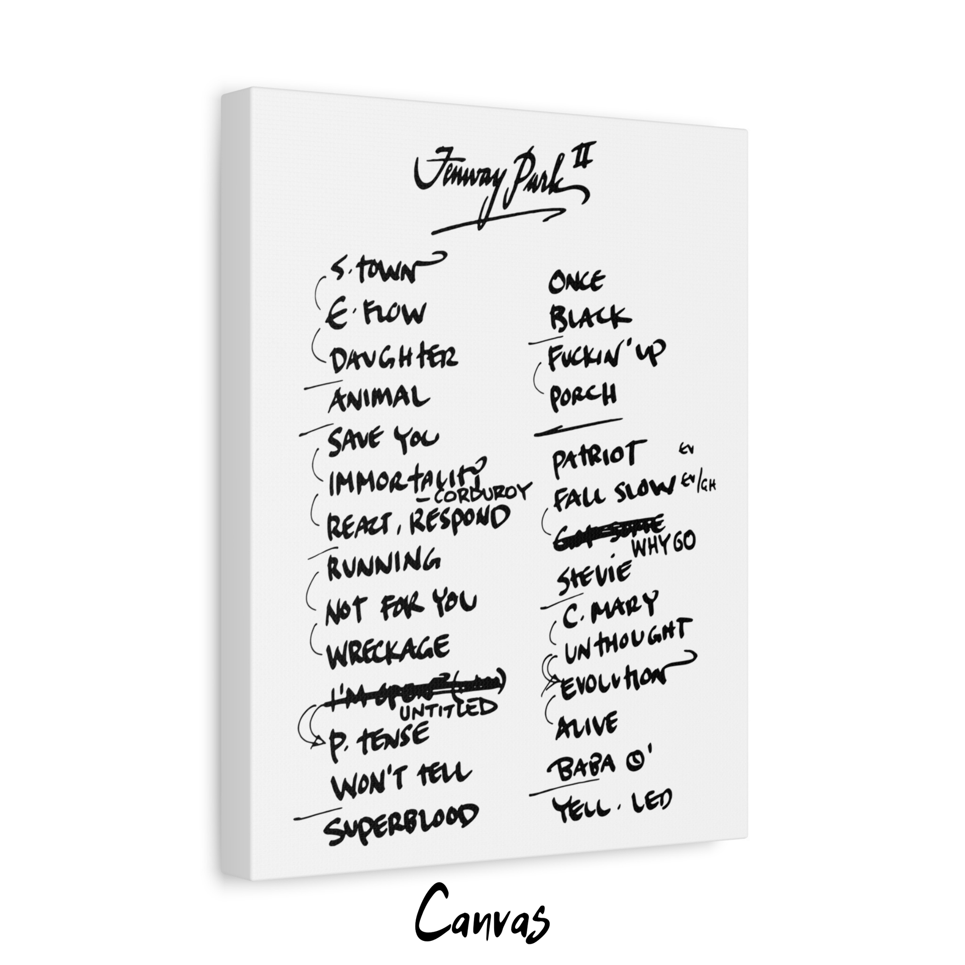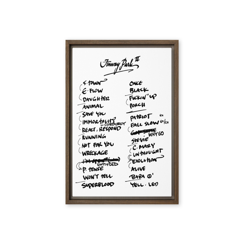 Setlist Art product options for printed posters, framed posters, canvas prints, and framed canvases on a white background.
