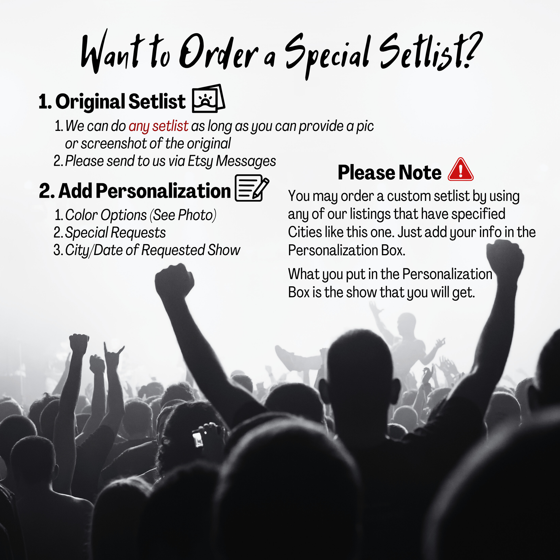 ⧫If you would like to request a different show that is not listed, we can recreate any setlist that has a picture. Just send a msg containing a pic or screenshot and give us the City/Date. We'll do the rest!!⧫