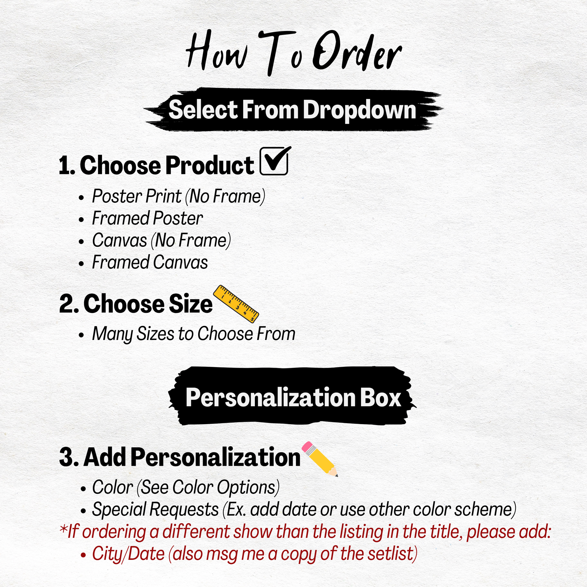 Setlist may include small imperfections, scribbles, and hand-written notes, depending on what setlists you pick. Some are hand-written and others typed. Final product represents my interpretation and re-creation of the original setlist that was used for a particular show. We try to keep the integrity of the authentic setlist, but sometimes minor cleanup and formatting is necessary. When you request a setlist, you may also list any special requests, such as including a date or removing unwanted scribbles or text. For instance, some customers prefer not to have any markup at all. They simply just want the song titles. Sometimes they want a product to be 100% like the original. Everything is customizable, so please reach out if you happen to have any special requests. I love working with everyone! Product is meant to be a huge part of your concert experience memory and something you can proudly display, along with your other concert posters and merch. Nothing better than displaying the songs that you've seen live to preserve that memory!